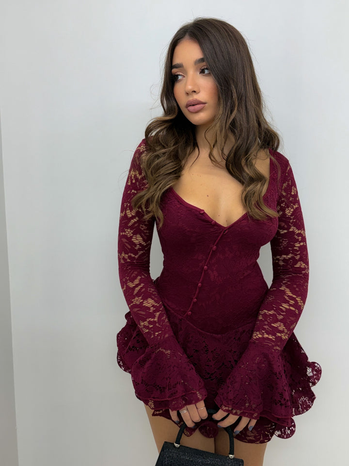 Vesti con stile con il nostro bellissimo abito Mirea "Bordeaux". Il pizzo delicato e lo scollo a V aggiungono un tocco di eleganza, mentre lo spacco laterale e i pantaloncini incorporati offrono comodità e versatilità. Taglia unica adatta a tutte le misure.