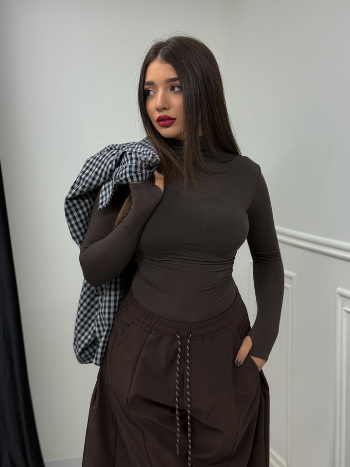 Questa maglia marrone "Ines" è elasticizzata con un maglia velata, un colletto elegante e maniche a guanto. La taglia unica si adatta perfettamente a qualsiasi figura, offrendo un look sofisticato e confortevole. Perfetta per ogni occasione.