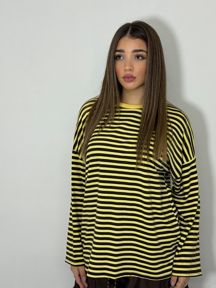 Entra nell'inverno con stile con la Maglia Paola "gialla"! Taglia unica oversize, questa maglia è perfetta per essere indossata in tante occasioni diverse. Con la sua fantastica fantasia a righe e il suo tessuto caldo ed elasticizzato, ti manterrà al caldo e comodo. Aggiungi un tocco di colore al tuo guardaroba e sii pronto a fare una dichiarazione di moda con la Maglia Paola "gialla"!