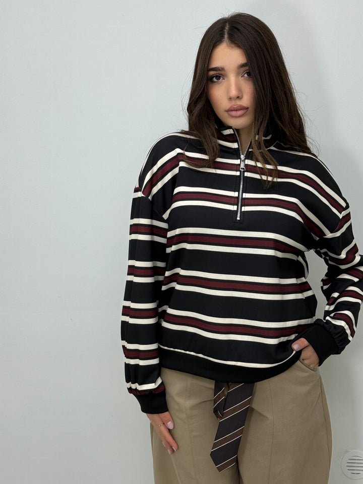 "Eleva il tuo stile con questa maglia righe elasticizzata con zip nel colletto. Perfetta per chi ama un look casual ma di tendenza. Taglia unica per adattarsi a tutti."