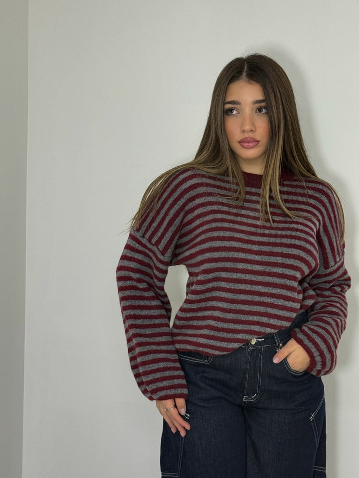 Aggiungi un tocco di stile al tuo look con Maglioncino Marta "bordeaux"! Realizzato in lana elasticizzata per un comfort senza pari, questo maglione presenta una fantasia a righe che ti farà risaltare dalla folla. La manica leggermente ampia dona un tocco di femminilità, rendendolo perfetto per ogni occasione. Taglia unica.
