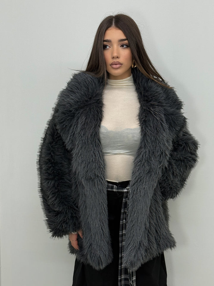 Vestiti con stile e comfort con la pelliccia oversize Lola. Riscalda il tuo look con la sua calda foderatura interna. Con taglia unica, è perfetta per ogni occasione e ti farà sentire sempre al top!